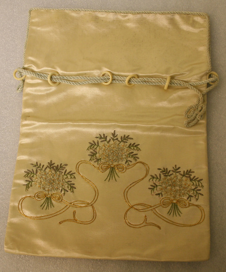 White silk purse or bag. Rectangular shaped. Lined with white silk. Embroidered design on one side of 3 clusters of forget-me-not flowers. Bouquets joined by gold metallic thread ribbon. Ivory rings sewn around opening with white silk cord woven through to act as drawstring and handle. Two flaps at front fold down over drawstring and rings.
