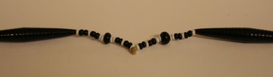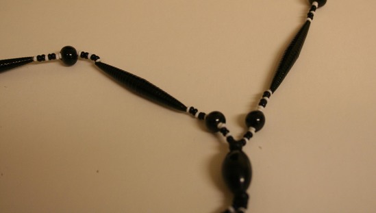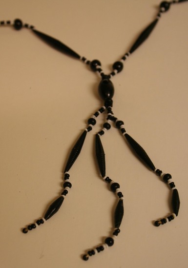 Black and white beaded necklace. Beads of alternating shapes and sizes. Long tubular black beads interspersed between around black beads and smaller groupings of small black and white beads. Three strands of beading hang from center of front of necklace.