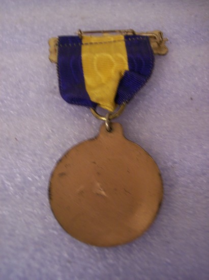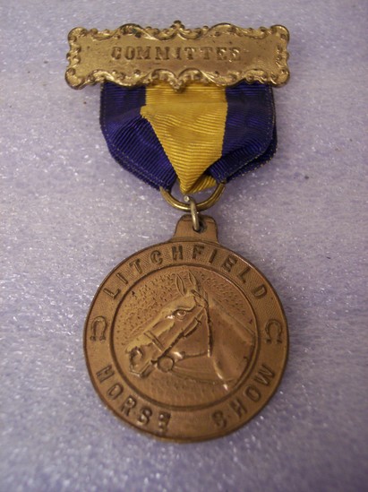 Round medal, bronze color, with image of horse's head in center. Raised lettering around horse's head. "Litchfield Horse Show". Medal attached to blue and yellow striped silk ribbon. Gold bar at top of ribbon with raised lettering "COMMITTEE"