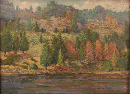Pastel on board. River in foreground, hill pasture with trees rising on opposite bank in soft spring foliage, with granite outcroppings, a bit of cloudy sky at top. Back has Kent Art Association label with artist's name and title "Spring Color" scratched out. "Bank of the River" written in. In red, "A. Purves" (Austin Purves) who presumably transported the pastel to exhibition for Miss Deming.
