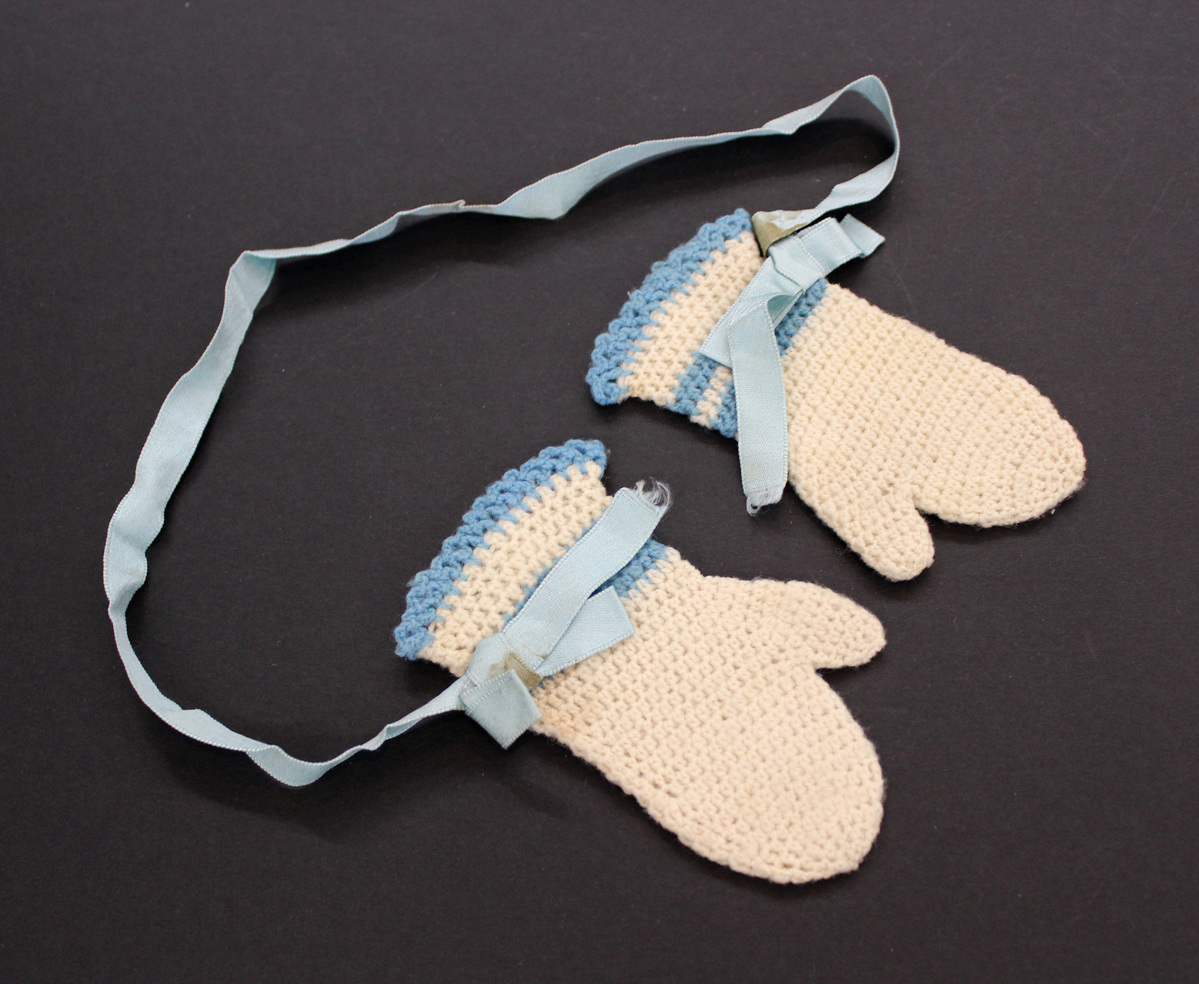 Pair of off-white crocheted child's mittens; two medium blue stripes at wrist and at top edge; medium blue silk ribbon bows and attaching the mittens