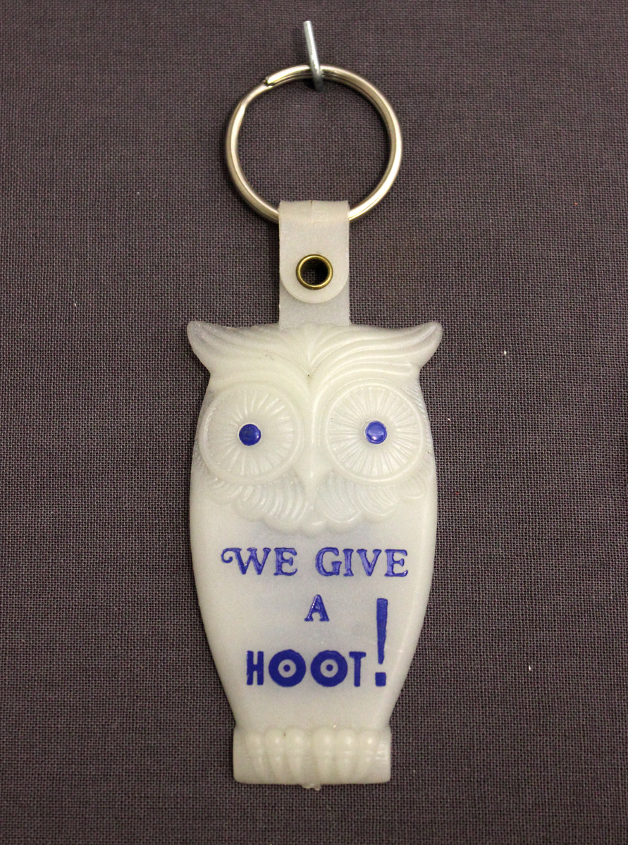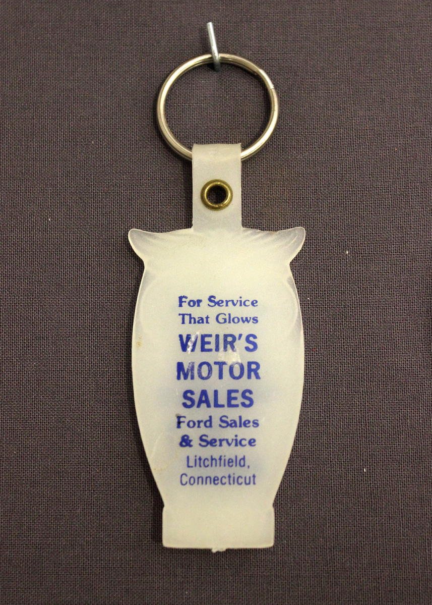 White plastic key chain with silver metal ring attached at top. Front of key chain is shaped and decorated to resemble an owl, with blue eyes. Blue lettering on body, "We Give/A/Hoot!" On reverse, blue lettering "For Service/That Glows/WEIR'S/MOTOR/SALES/Ford Sales/& Service/Litchfield,/Connecticut."
