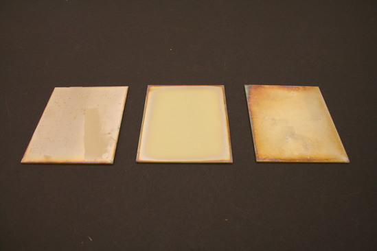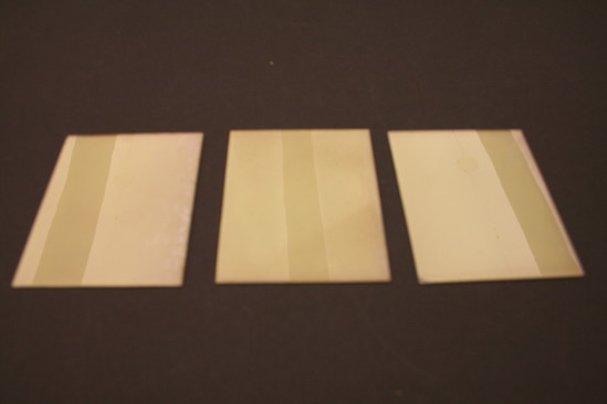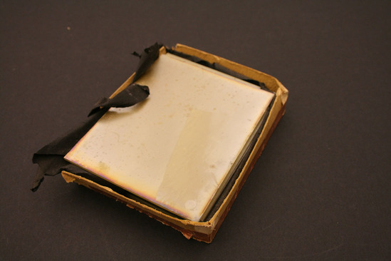 10 glass plate negatives - unexposed; glass is opaque, almost murkey; has been treated with chemicals; negatives are housed in the bottom of a cardboard box and somewhat wrapped in opaque black paper