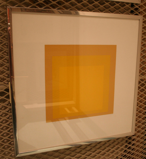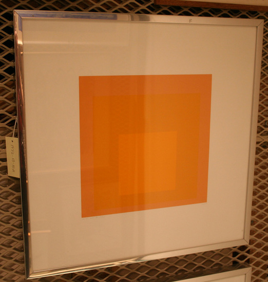 A - Silk screen print of three orange squares, each increasingly smaller in size and one inside of the other one. On white paper. Framed in silver metal frame. Marked in pencil at lower left, "I'-S' LXX a 107/125," and signed at lower right, "A '70." B - Silk screen print of three yellow squares, each increasingly smaller in size and one inside of the other one. On white paper. Framed in silver metal frame. Marked in pencil at lower left, "I'-S' LXX b 107/125," and signed at lower right, "A '70."