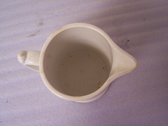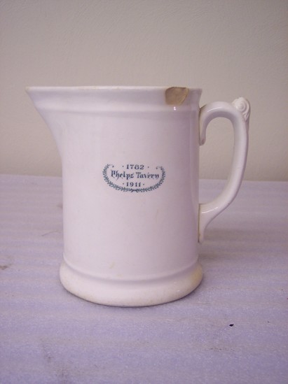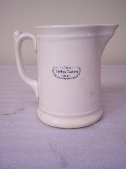Vitreous glazed earthenware white cylindrical pitcher with modified helmet spout, simple moulded handle with single acanthus leaf decoration at top of thumb-grip. Moulded bands at rim and base. Underglaze dark green printed mark of wreath enclosing 1782/Phelps Tavern/1911 on side.