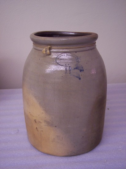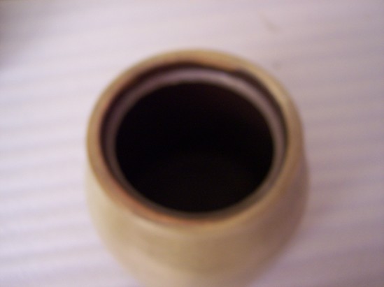 Grey glazed exterior with dark brown interior. Appears to have been burned. Cobalt blue around mark. Rolled rim with plain base. Inscribed lines at top. Glaze is uneven.
