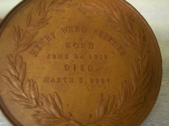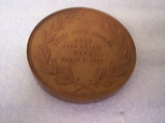 Heavy thick round bronze medal with raised edge. Face: right facing bust of profile of Henry Ward Beecher. Obverse: crossed laurel wreath, inscription "HENRY WARD BEECHER/BORN/JULY 24TH, 1813/DIED/MARCH 8, 1887"