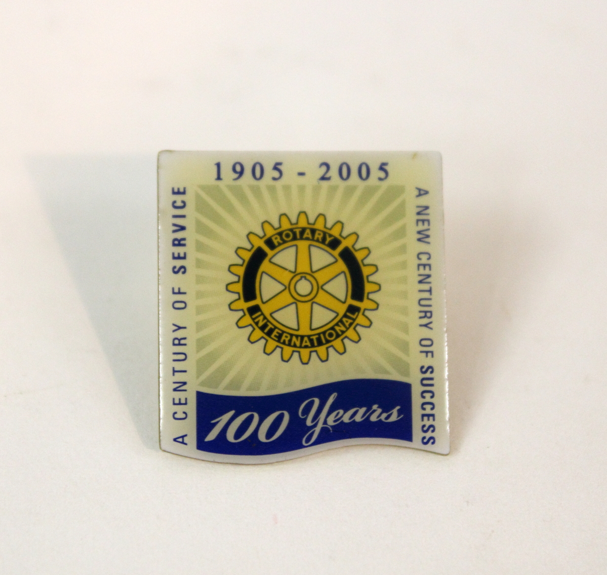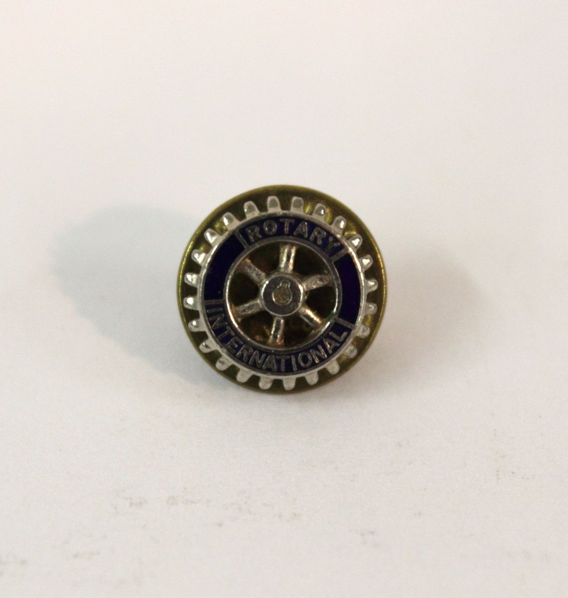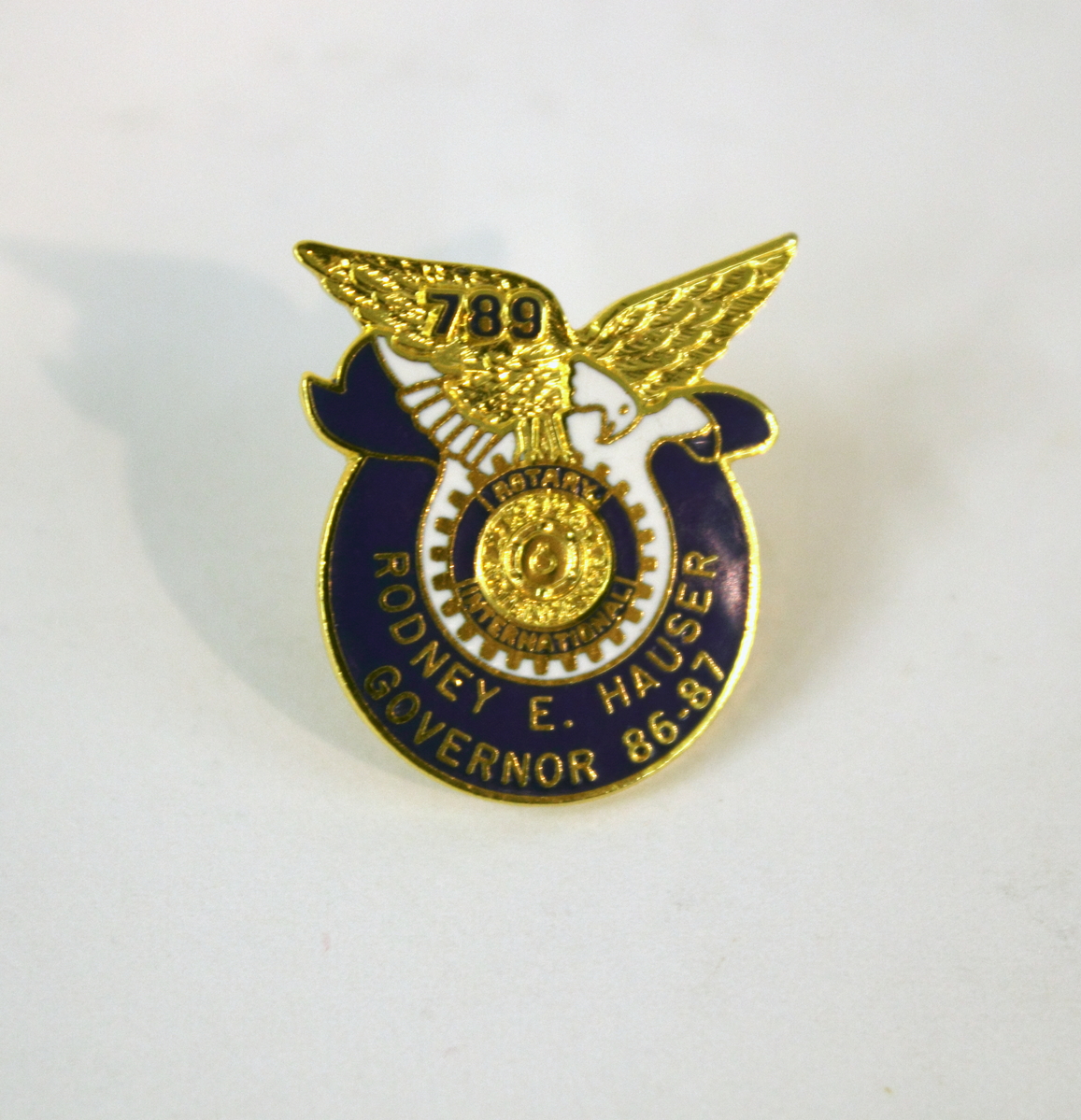 a: Rectangular metal Rotary Club pin. 1.125"H x 1.25"W x .375"D. Front is enamel, dark blue background with Rotary International logo placed center left. Eight rectangular bars run from behind logo, colored blue, teal, orange, green, yellow, indigo, violet, and white. Top, left and bottom extend past the dimensions of the rectangle slightly. Right bar is white with yellow borer and has dark blue lettering "LEAD THE WAY". On back, metal pin and repeated lettering "NATIONAL AWARD/ SERVICE/800-810-2100". b: Square metal Rotary Club pin. 1"H x 1"W x .375"D. Front is enamel and metal, with black background and gold border. In center, image of Rotary International logo surrounded by half blue, half gold oval swirl. Along top, gold lettering "CREATE AWARENESS", along bottom "TAKE ACTION". On back, metal pin with repeated pattern of lettering "GERRY WHITE PIN CO./ 941-342/ 6060/ MADE IN MALAYSIA" surrounded by checkerboard pattern. c: Rectangular metal and enamel Rotary Club pin. 1"H x .875"W x .375"D. Front is enamel with white background. Center is image of Rotary International logo. Around edge in blue lettering "A CENTURY OF SERVICE/ 1905-2005/ A NEW CENTURY OF SUCCESS". Along bottom, blue wavy background with white script lettering "100 years". Bottom edge of pin has slight wave pattern. On back, metal pin with black lettering "NATIONAL AWARD/ SERVICES/ 800-810-2100". d: Metal and enamel Rotary Club pin. 1"H x .875"W x .375"D. Front of pin, in center Rotary International logo with inscription in center "*100%*/ ATTENDANCE". Above logo is an image of an eagle with wings outstretched. Eagle is gold with white head and tail feathers, with raised blue lettering "789" on left wing. Running alongside bottom is image of blue ribbon with gold trim, on ribbon in gold letting "RODNEY E. HAUSER/ GOVERNOR 86-87". On back metal pin and repeated patterns of slightly raised dots. e: Metal and enamel tie tack with metal pin and fastener. .75"H x .5" W x .5" D. Pin is gold with dark blue enamel, shape of Rotary international logo with two images of blue enamel ribbon above and below. On top ribbon gold lettering "PAST" and on bottom "PRESIDENT". Inlaid in center is diamond. On back metal pin attached to fastener. At bottom engraving "10K" with logo underneath. f: Round metal Rotary club lapel pin. .5" Diameter x .375" Depth. Metal silver-colored Rotary International logo with blue enamel.
