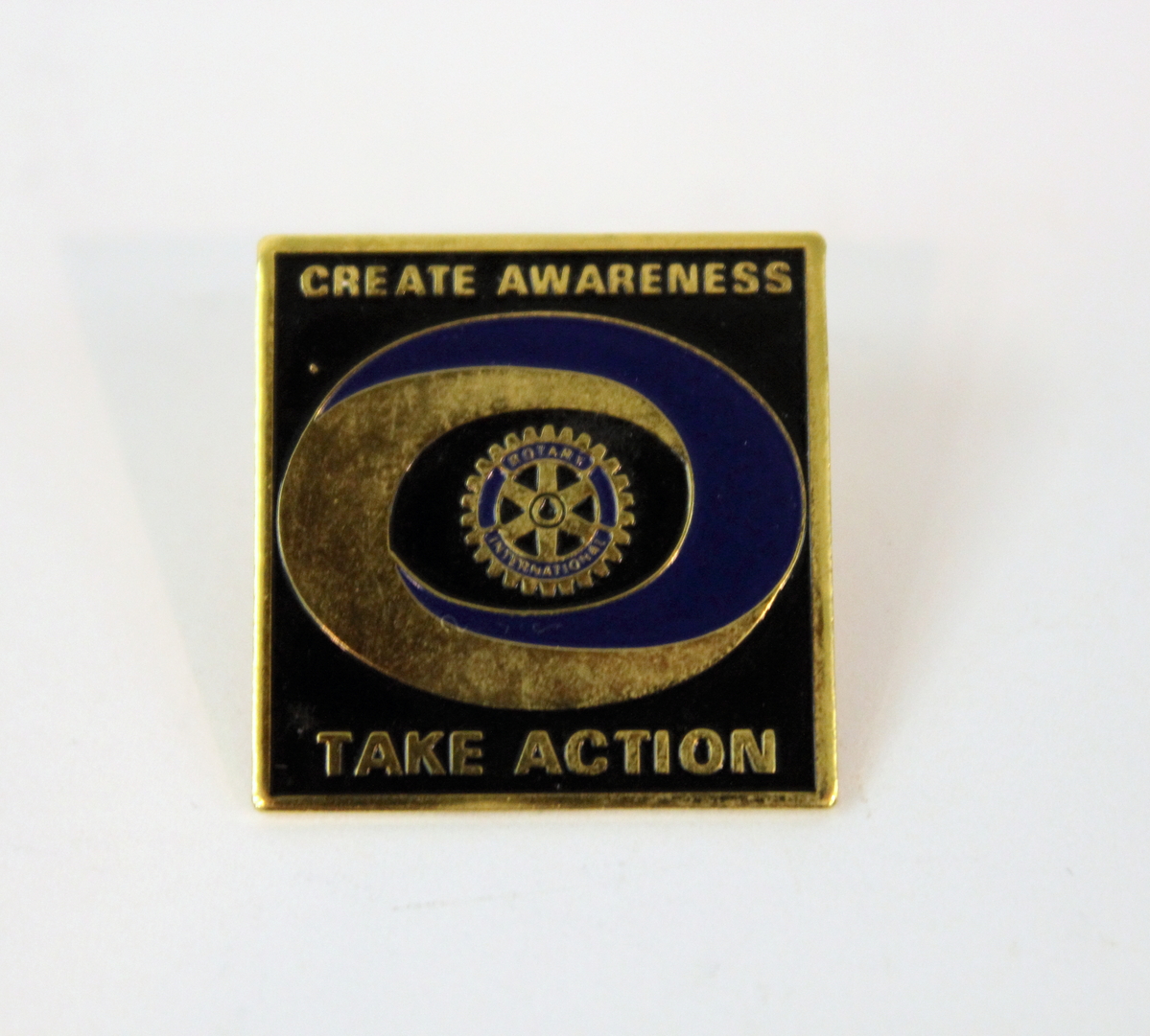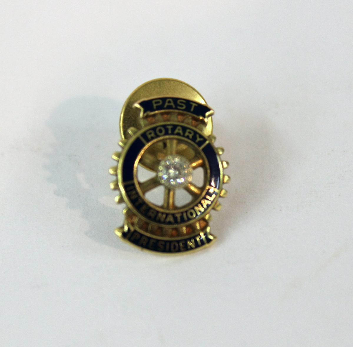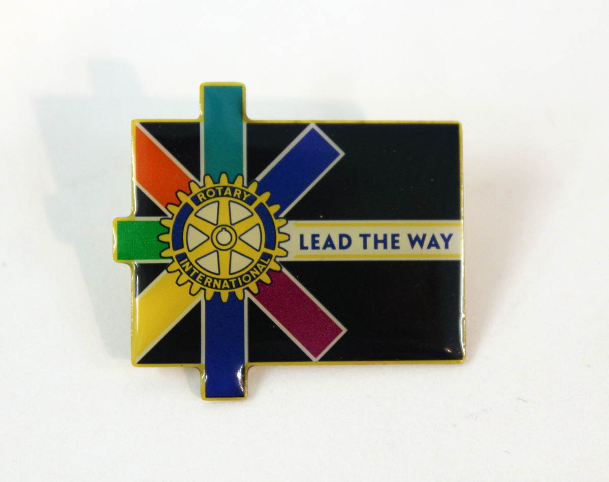 a: Rectangular metal Rotary Club pin. 1.125"H x 1.25"W x .375"D. Front is enamel, dark blue background with Rotary International logo placed center left. Eight rectangular bars run from behind logo, colored blue, teal, orange, green, yellow, indigo, violet, and white. Top, left and bottom extend past the dimensions of the rectangle slightly. Right bar is white with yellow borer and has dark blue lettering "LEAD THE WAY". On back, metal pin and repeated lettering "NATIONAL AWARD/ SERVICE/800-810-2100". b: Square metal Rotary Club pin. 1"H x 1"W x .375"D. Front is enamel and metal, with black background and gold border. In center, image of Rotary International logo surrounded by half blue, half gold oval swirl. Along top, gold lettering "CREATE AWARENESS", along bottom "TAKE ACTION". On back, metal pin with repeated pattern of lettering "GERRY WHITE PIN CO./ 941-342/ 6060/ MADE IN MALAYSIA" surrounded by checkerboard pattern. c: Rectangular metal and enamel Rotary Club pin. 1"H x .875"W x .375"D. Front is enamel with white background. Center is image of Rotary International logo. Around edge in blue lettering "A CENTURY OF SERVICE/ 1905-2005/ A NEW CENTURY OF SUCCESS". Along bottom, blue wavy background with white script lettering "100 years". Bottom edge of pin has slight wave pattern. On back, metal pin with black lettering "NATIONAL AWARD/ SERVICES/ 800-810-2100". d: Metal and enamel Rotary Club pin. 1"H x .875"W x .375"D. Front of pin, in center Rotary International logo with inscription in center "*100%*/ ATTENDANCE". Above logo is an image of an eagle with wings outstretched. Eagle is gold with white head and tail feathers, with raised blue lettering "789" on left wing. Running alongside bottom is image of blue ribbon with gold trim, on ribbon in gold letting "RODNEY E. HAUSER/ GOVERNOR 86-87". On back metal pin and repeated patterns of slightly raised dots. e: Metal and enamel tie tack with metal pin and fastener. .75"H x .5" W x .5" D. Pin is gold with dark blue enamel, shape of Rotary international logo with two images of blue enamel ribbon above and below. On top ribbon gold lettering "PAST" and on bottom "PRESIDENT". Inlaid in center is diamond. On back metal pin attached to fastener. At bottom engraving "10K" with logo underneath. f: Round metal Rotary club lapel pin. .5" Diameter x .375" Depth. Metal silver-colored Rotary International logo with blue enamel.
