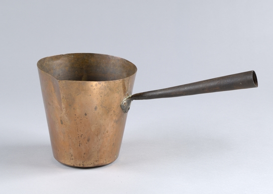 Round base soldered to sides, tapered flared walls with slight triangular spout, 90 degrees from handle. Handle is roll of sheet iron tapered with lozenge three rivet attachements.