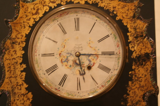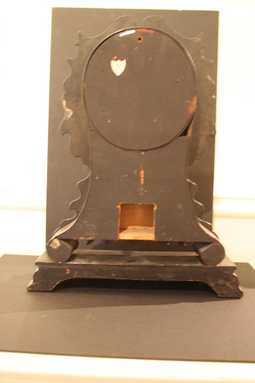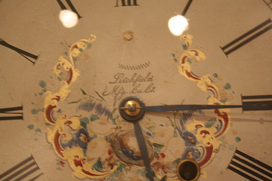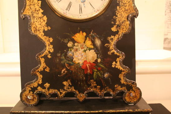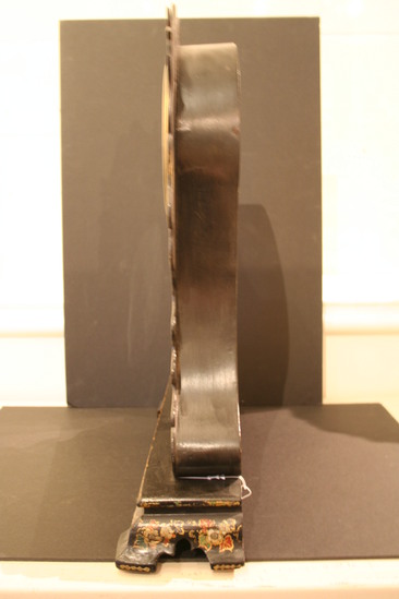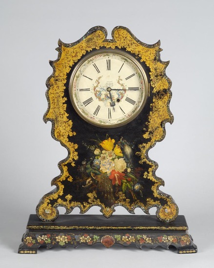 Shelf clock made by the Litchfield Manufacturing Company. The clock case is made of wood and then covered with black laquer. The case is then decorated with papier-mache decorations of mother of pearl, shell and gold leaf. The clock face is white enamel and has "Litchfield Manufacturing Company" written in script lettering in center. The clock works are metal.