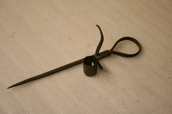 Pointed square end for sticking into wall, opposite end large loop for carrying; at mid point hook sticking up from shaft with a curved over strap set vertically for holding a candle.