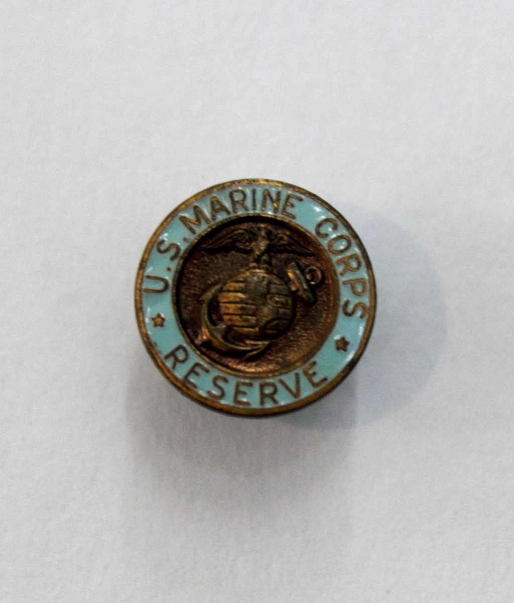 Bronze circular stud lapel pin. In center, relief of USMC insignia. Surrounding this insignia is a circle of light blue enamel with gold lettering "* U.S. MARINE CORPS */ RESERVE". Engraved on back of button "BASTIAN BROS. CO. ROCH. N.Y.". USMC Reserve lapel pin, possibly World War II era.