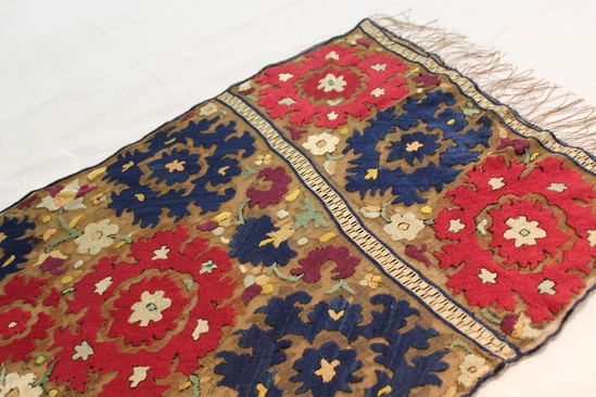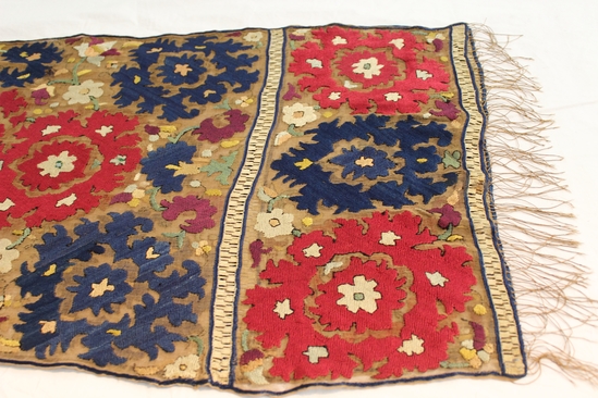 Shawl; off white/beige ground; floral design in filet crochet; predominately blue and red silk thread with yellow, white, and purple also; fringe on two ends in beige color; on each end are two vertical stripes with geometric type pattern in white thread