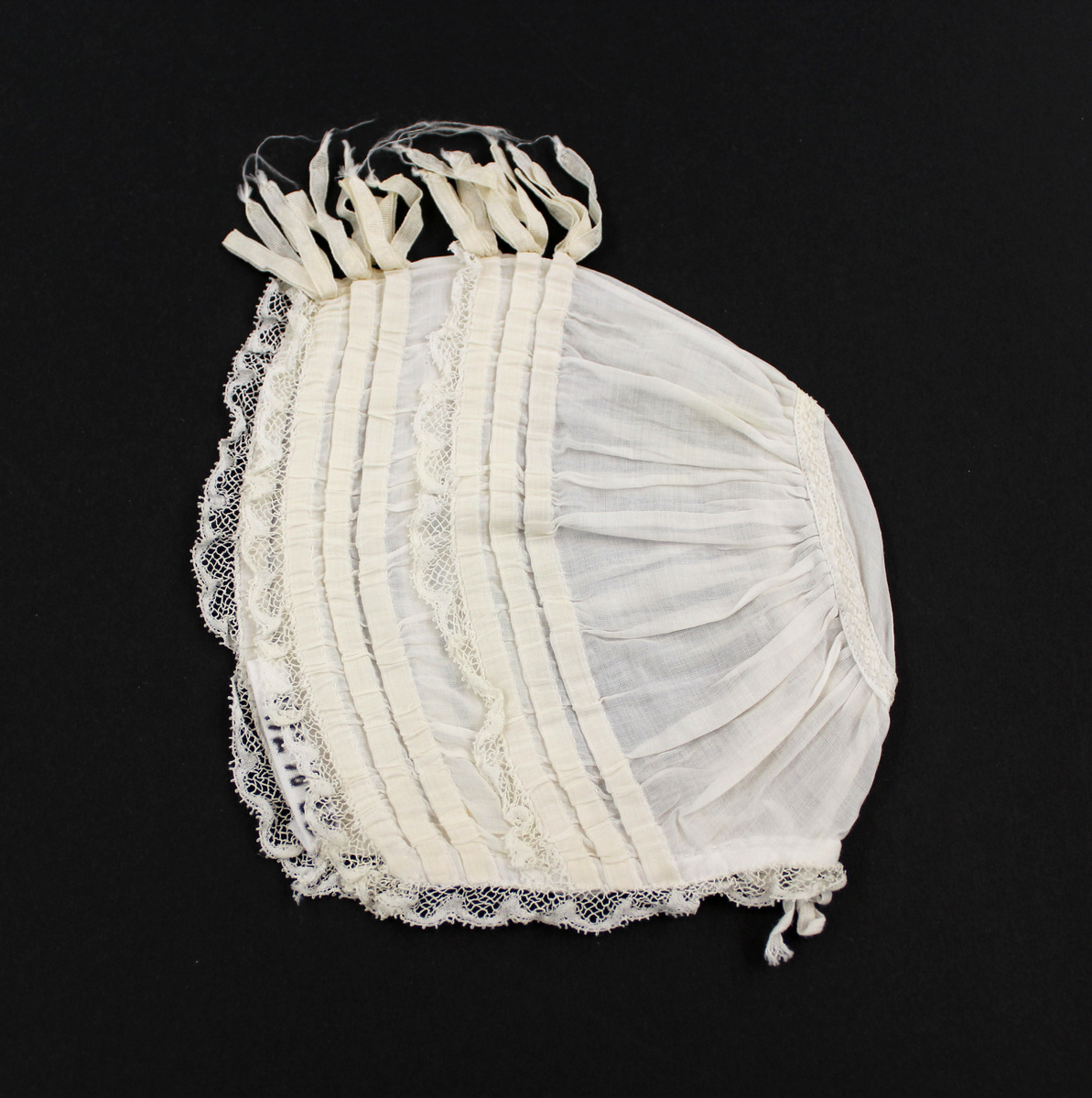 White cotton child's bonnet; tucks with lace ruffle; silk ribbon bows on top; embroidered tape around back of crown; silk ribbon drawstrings at center back; no ties