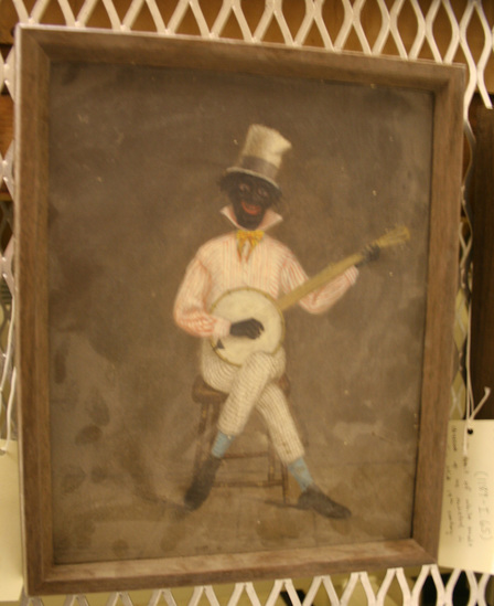 According to the object record, the performer was a friend of the artist (Hiram Matthews, who lived on Prospect Street) and a white resident of town. The accession book entry states that "the minstrel was one of the 'boys'," likely referring to a group of white friends who put on a minstrel performance in town.