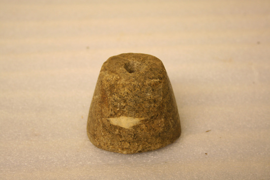 Soap stone ink well. Round shape, narrowing towards top with cylindrical hole at top for ink.