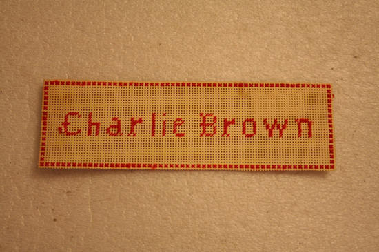 Paper bookmark - paper perforated with series of small holes. Border of Xs in red yarn on all four sides. In center "Charlie Brown" in red thread.