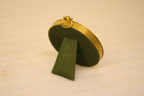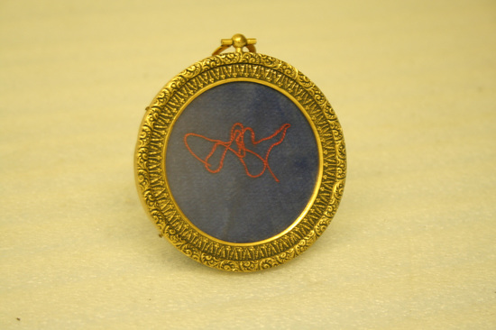 Red silk thread framed in round gilt brass frame with blue velvet background. The thread was taken from the sash worn by Gen. de Lafayette at the Battle of Brandywine