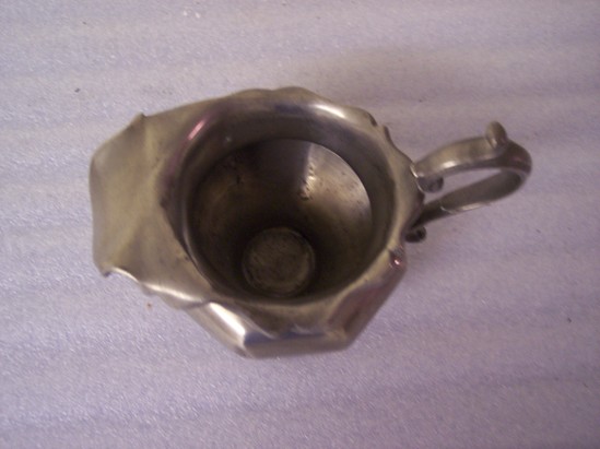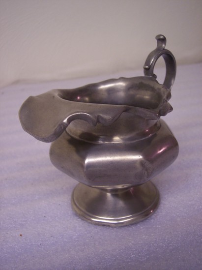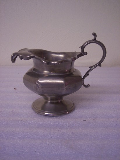 Round base, octagonal paneled bulbous body with rococo bent over rim and spout. Double cyma handle with rococo knobs. Marks on base of creamer - "W.P./Broadhead & Co/Sheffield"