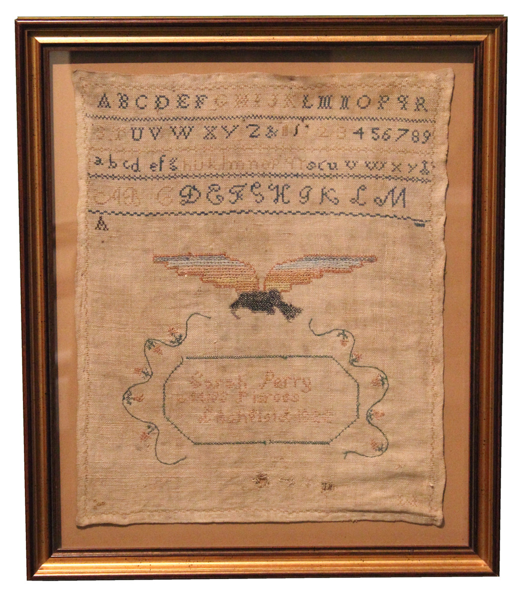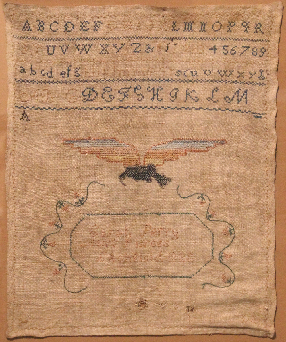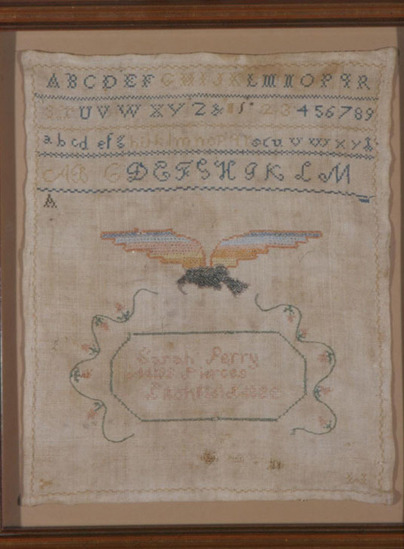 Linen thread sampler with bound edges, scalloped border in beige thread, with large cross stitch alphabet (A-R) on top line, S-Z and block 2-9 on second line, a-y on third line, A-M in upper case script and fourth line, all in beige and blue threads with lines of different stitches between. Below, eagle with black cross-stitch body with wings of blue, pink, yellow and brown, outlined in beige. Underneath, green extended octagon with floral flanking vines - inside octagon "Sarah Perry/Miss Pierces/Litchfield 1822" in pink cross-stitch.