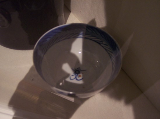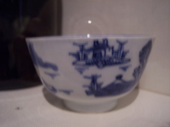 Tea bowl (i.e. handle-less teacup) on a round, footed base with blue-banded rim and an Asian scene of two houses, trees, and birds.