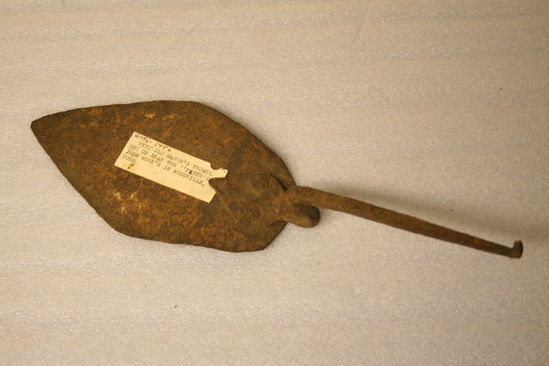 Square iron handle curves into an S shape at the base and is riveted on to the top of the diamond-shaped smoothing blade. The trowel was dug up near Peter's Iron Works in Woodville by William H. Cone