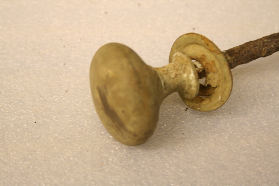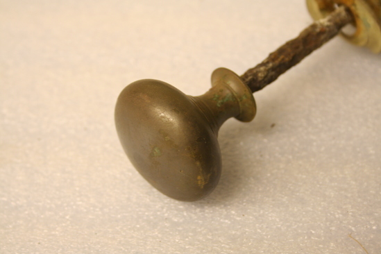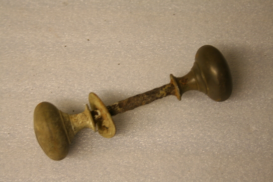 two small brass door knobs connected by brass rod. One more corroded than other.