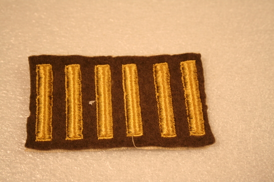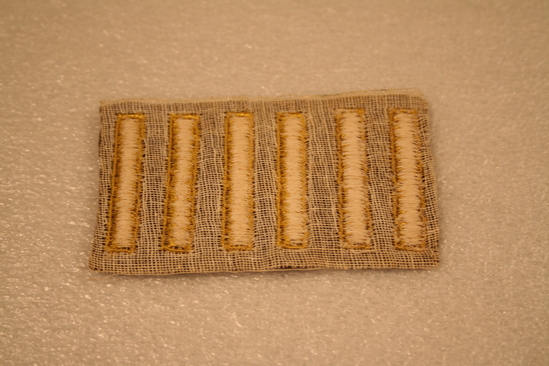 Rectangular shaped patch, olive green wool background with 6 yellow rectangles stitched in a line.