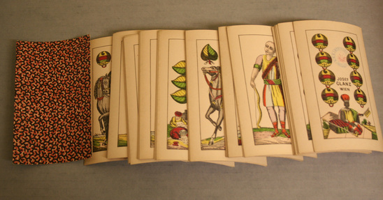 Incomplete deck of cards - 32 cards, divided into 4 suits by symbols - bell, acorn, heart and leaf. Back side of card has red and white printed design with black vine like design printed over top.