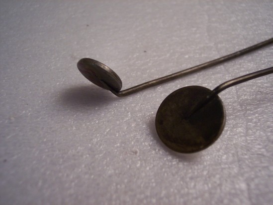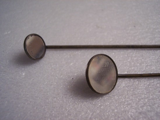 Both look just like the little long handled examination mirrors used by dentists. Laryngoscope - iron shaft and handle Posterior Rhinoscope - brass shaft and wooden handle both with round mirror on end