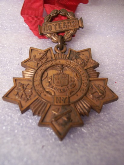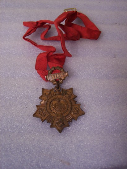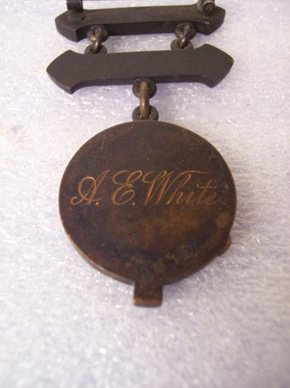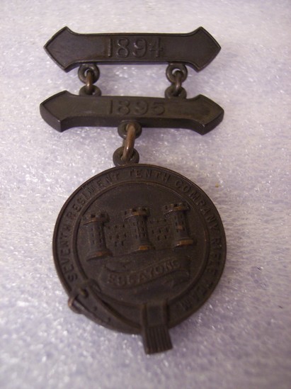 A: 22" red grosgrain ribbon with tin clasp for affixing around neck; threaded through oak cluster with keystone legend "10 Years" One large link to maltese cross medal, 1 3/4" diameter. Each wing of cross with oak cluster and military implements, center NY state seal, with "Faithful Service/NY" around center. On back "TIFFANY & CO/No. 224" B: Black copper medal, double arrow shaped pin bar with 1894 on it. Three links either side to same shaped bar with "1895" on it. Three center links to round metal, 1 1/4" diameter; castle with thee towers in center and banner with "ESSAYONS" below. Outer edge shaped like belt or garter with "SEVENTH REGIMENT TENTH COMPANY RIFLE TEAM" On reverse printed "A.E. White"