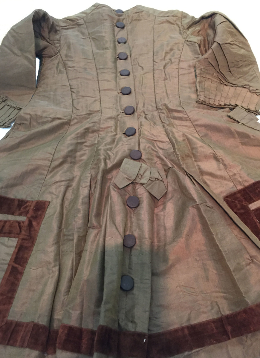 Would have been worn with a lace collar and stiffened petticoat to simulate a bustle in back.