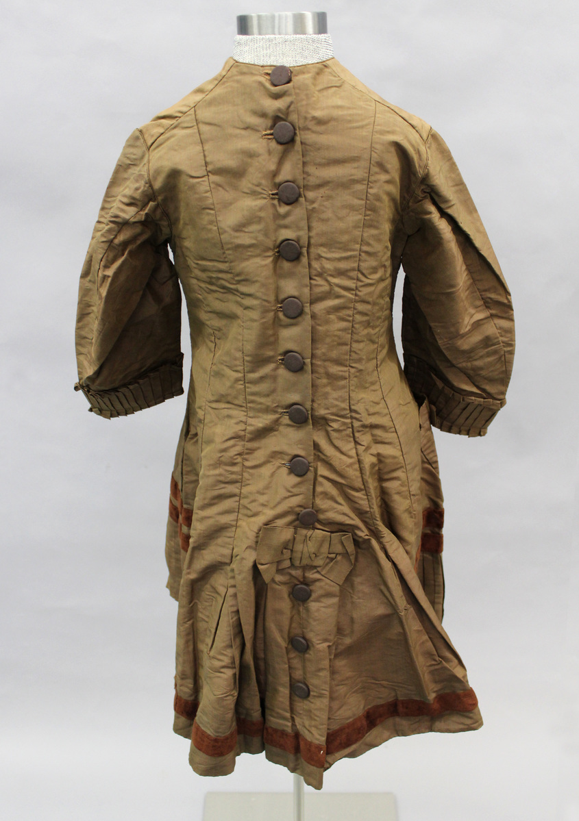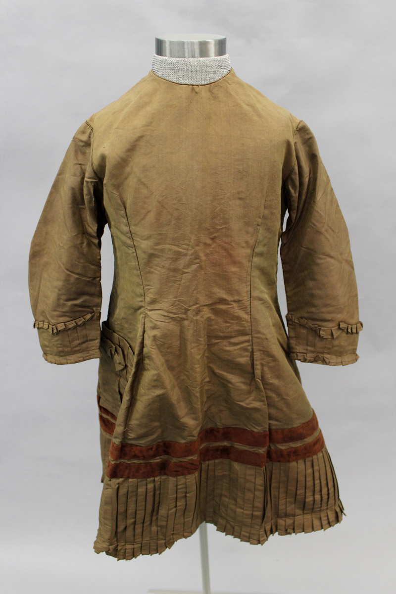 Brown silk A-line girl's dress. Princess seams front and back. Long sleeves with knife pleated cuffs. Knife pleats at hem. Pocket with bow at right side. Brown velvet trim at hips and back hem. Covered metal buttons with dark brown silk down center back with bow. Brown glazed cotton lining. Piping at round neckline and at armscye.