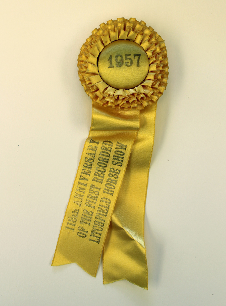 Yellow satin ribbon with rosette of yellow satin on top, circular button in center. Button stamped at center in gold lettering, "1957." Two satin tails extending below rosette; left tail stamped with gold lettering, "118th ANNIVERSARY/OF THE FIRST RECORDED/LITCHFIELD HORSE SHOW." Metal hook on reverse with blue and white paper label for Pegasus Sales Co., New York, NY.