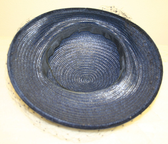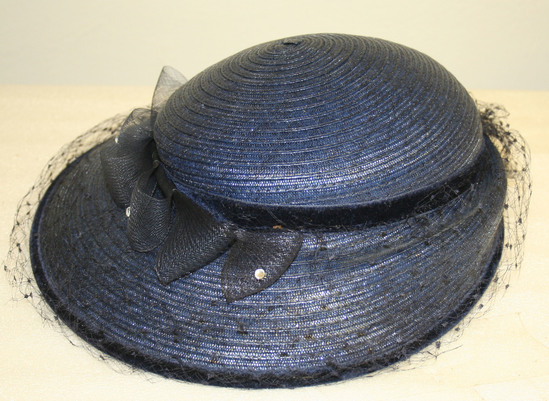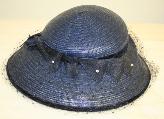 Navy blue straw hat, wide brim - widest at front, rounded crown, blue net bow around hat where crown and brim meet - a few glass beads sewn onto bow. Navy blue net veil around brim of hat. Blue grosgrain ribbon around interior of hat. Elastic band sewn into ribbon
