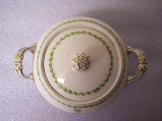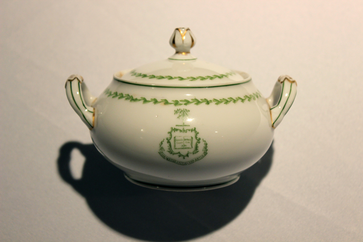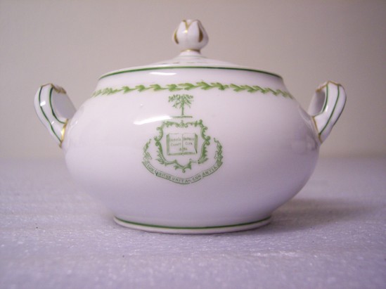 Green lines and chains of green leaves on rim of white sugar bowl. Sugar bowl (A) has two handles. Green shield with tree crest in a rococo frame around a book with "Litchfield County/University Club/1896" and scroll underneath with "Lux Caritus Unitas Constantis." Lid (B) has pomegranate finial.