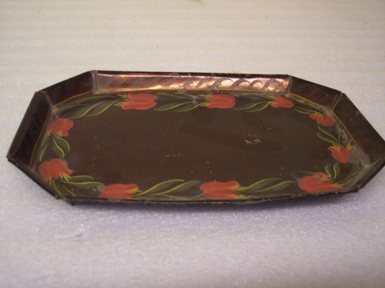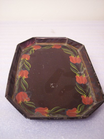 Coffin lid shaped tray with brown background, slanted sides with rolled top having SSSS decoration in black. On bottom around outside is a band of well painted red tulips in chain with two tone green leaves. Scratched on abck is "Waterbury (?) September 1825" along one short end and "Polly Filley, A Present from/E. Filley" along long side