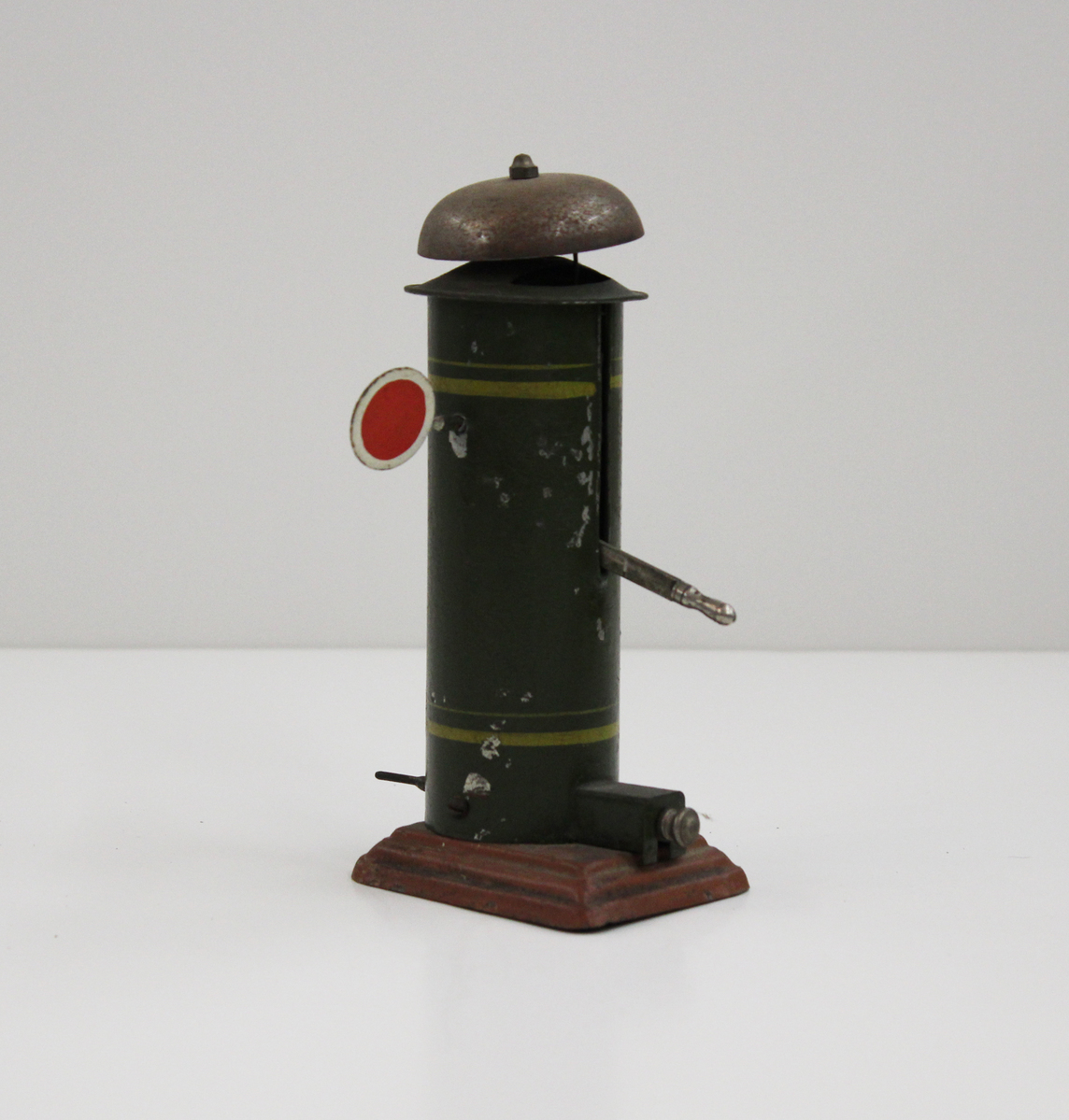 Early 20th-century tinplate railway bell tower, possibly made by Märklin. Cylindrical bell tower on rectangular base, with domed bell at the top. Extending from one side is a metal arm attached to a circular metal signal, painted green on one side and red one the other. A long metal lever extends from another side with a small rectangular extension running underneath it, along the base. A short metal arm extends from the bottom of the tower on the opposite side. The tower is painted green with horizontal yellow stripes near the top and bottom; the base in painted brown.