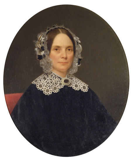 Oil on canvas 1/2 length oval portrait of Lucretia Deming (1804-1887) as an older woman, turned to the right, brown hair parted in the middle, with a white lace bonnet with side pieces decorated with feathers and artificial flowers, brown eyes, wearing a dark dress with white lace collar a gold and sea pearl hair brooch at her neck, seated in a red chair, dark background.