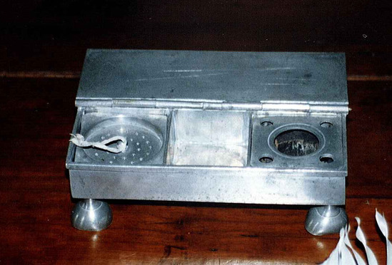 Pewter inkstand, rests on bun feet, box with central hinge across top. One side without dividers for storing quills and pens, the other side divided in three parts: inkwell and sander, either sides of empty center compartment.