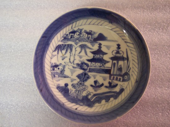 White saucer with blue-banded rim and an Asian scene of two houses, trees, and birds.