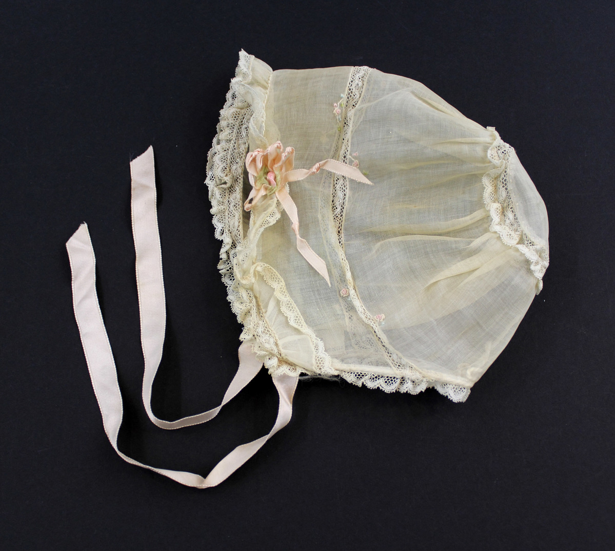 Off-white sheer cotton voile child's bonnet; double lace ruffles at front; lace ruffle at neck and center back circle insertion; lace insertion on sides; pink and green floral embroidery on either side of lace insertion; peach-colored silk bow and flower at left side; peach-colored silk ribbon ties; drawstrings at center back; off-white silk label with gray lettering at right front: "Lord & Taylor / Fifth Avenue"