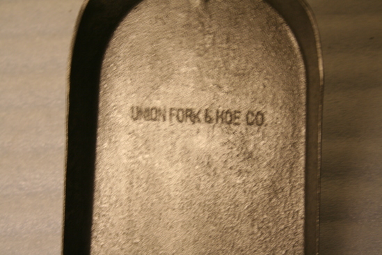 Arched shaped shovel with tapered sides, round handle with thickened end, hole near top of hollow handle.