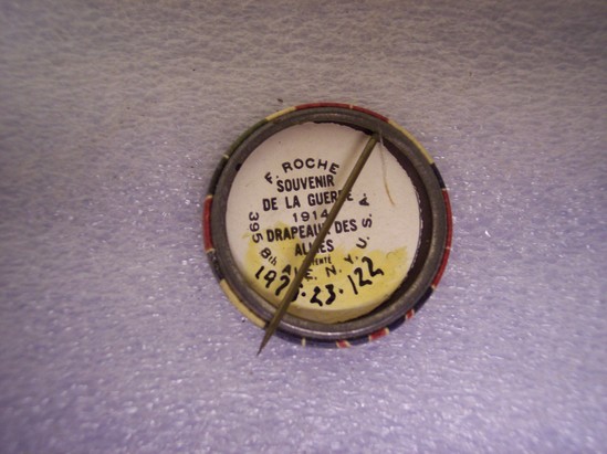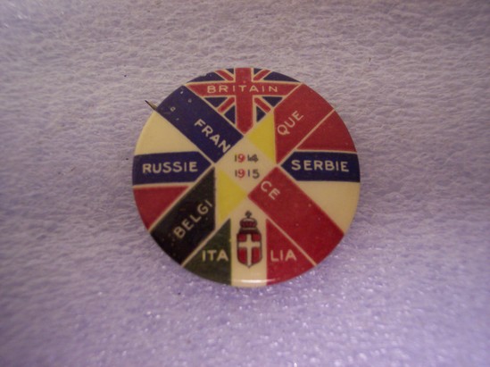 Round metal button with long metal stick pin across back. Thick cross in center. One arm of cross has colors of Belgium's flag with "Belgique" written across. Other arm of cross has colors of French flag with "France" written across center where two arms meet is white "1914-1915". In each corner is a different name of country and the colors of their flag - Britain, Serbie, Italia, Russie. Label on back "Souvenir/de la Guerre/1914/Drapeaux des/Allies"