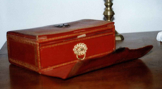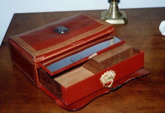 Red dyed leather with repeating tooled design in gold leaf. Has a folding front cover that fastens into steel lock on top. The top has an accordian style compartment for razors and a slot for a sliding mirror. There is a wooden drawer, fronted by an ornate brass escutcheon with ring pull, opening to a wood compartment divided in three sections, one covered. Given by Fanny Lord, to Dr. John L. Buel.