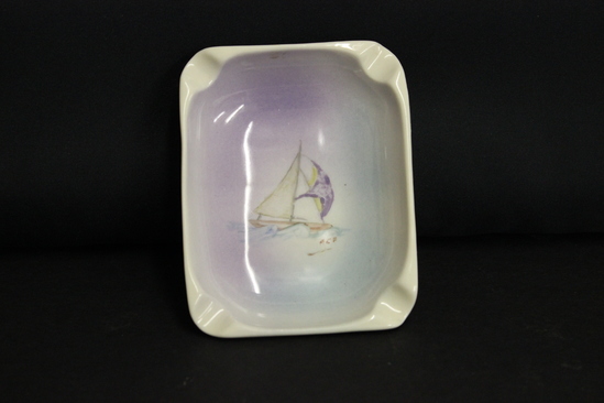 Rectangular ashtray with indentations in each corner. Inside is painted lilac moving to sky blue. At the center is the image of a sailboat amid rolling waves. The artist initialed the work at the lower right.