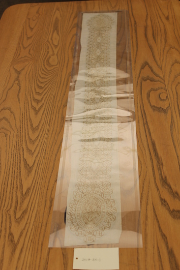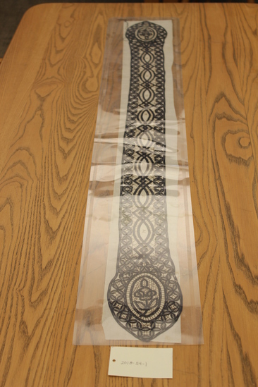 Long, narrow piece of ivory parchment with a waxy finish. Stylized flowers at ends with quatrefoils and decorative intersecting bands through the center drawn in ink on one side. Black cotton Honiton lace worked on one side - not finished.