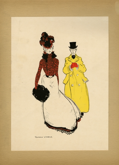 Print on white paper. Paper mounted on board. Woman wearing skirt, bodice, and hat, holding a muff. She walks in front of a man wearing a top hat, coat, and gloves. Print executed in black, red, and yellow.