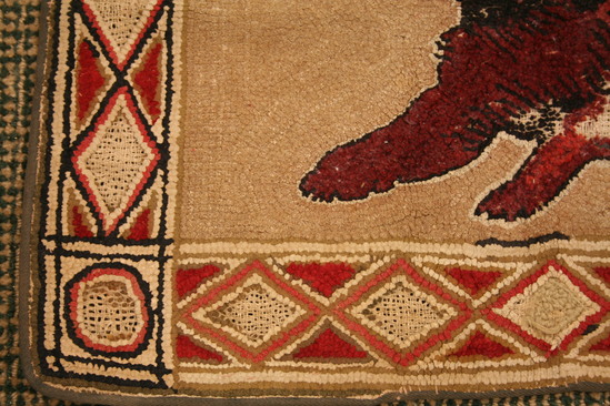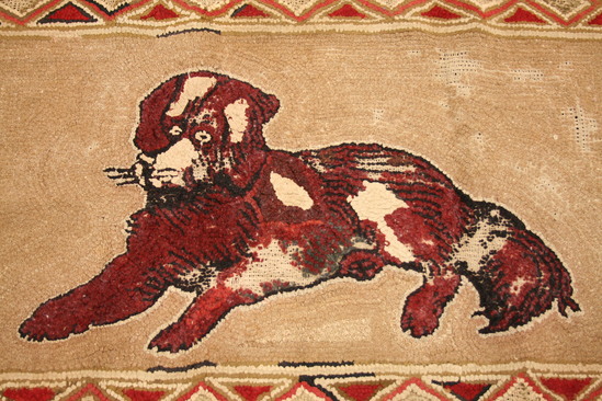 Rectangular mat, hooked wool on linen ground; image of dog in center in red yarn. Border - circle in each corner with band of repeating diamonds in between - done in greenish beige, pink, and red; black yarn worked in some areas - possibly as a repair to lost areas.